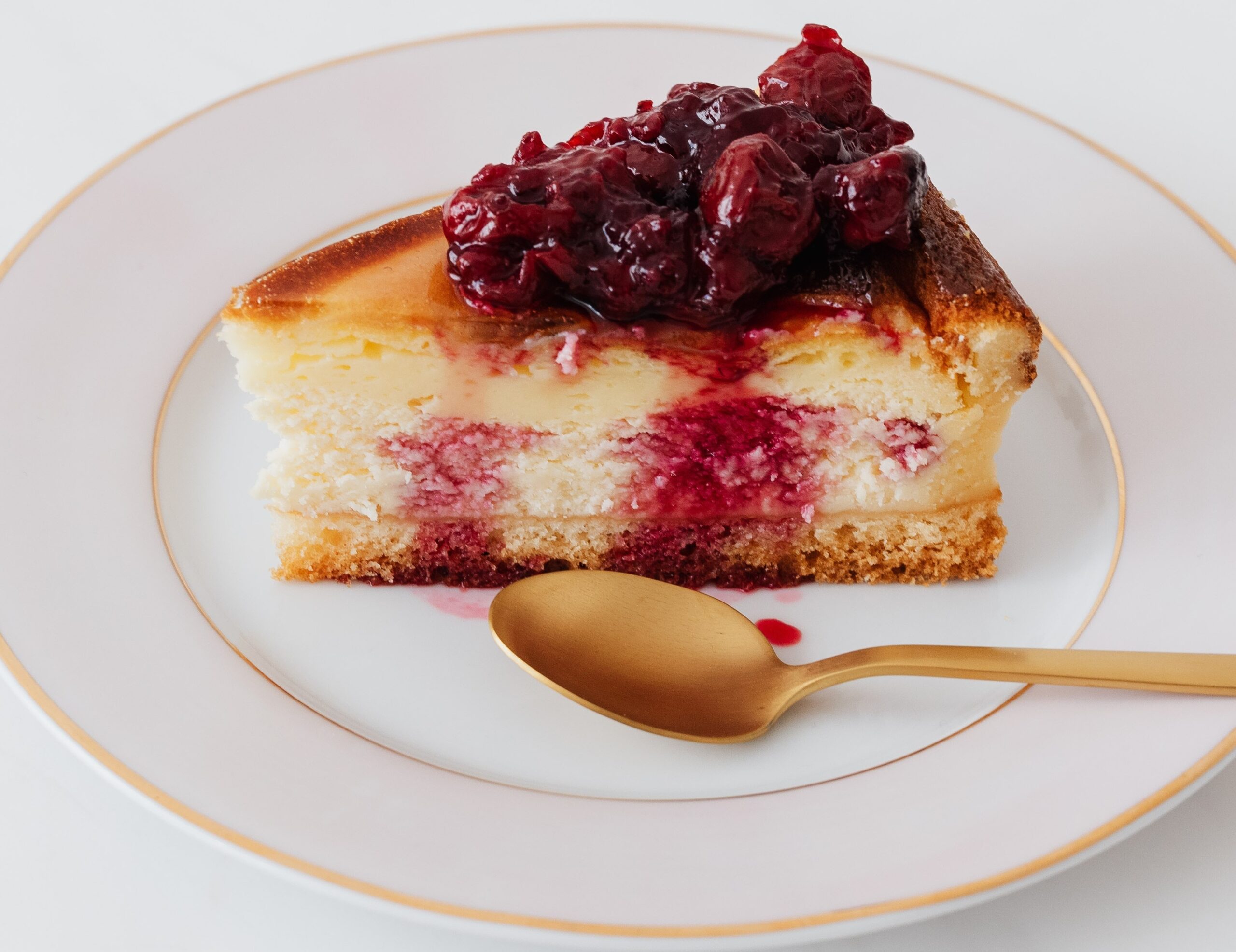 - 7Now, pour one-third of the batter into the greased cake tin. And spoon 8 rounded teaspoonfuls of the strawberry jam over the batter, and swirl with a wooden skewer. Repeat this until all the batter has been added.